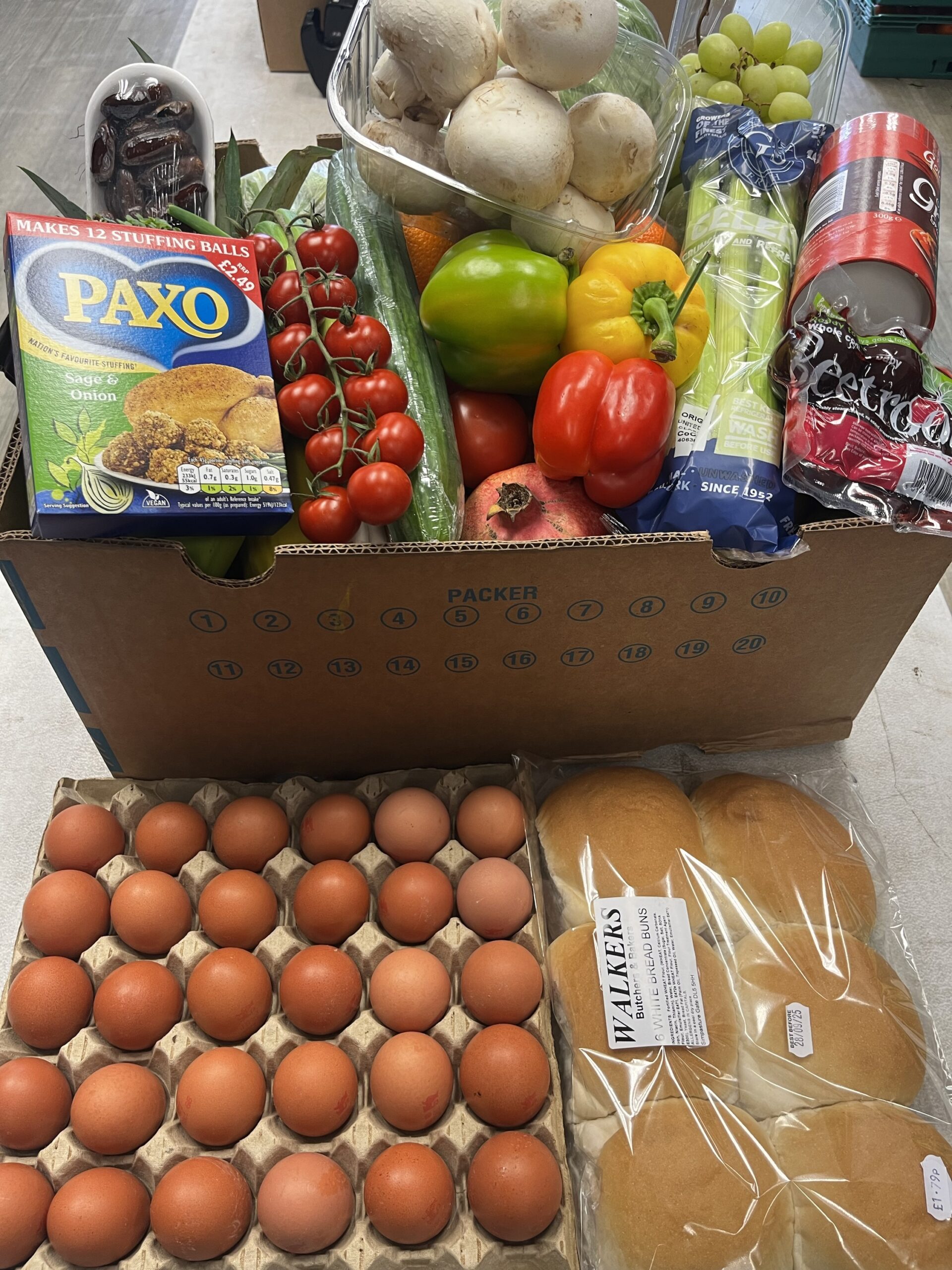 welcome to this years new xmas box we have added to our range ,this box ncludes a mixture of cabbage, cauliflower brussel sprouts broccoli parsnips 2kg potatoes carrots swede new scraping potatoes onions melon pineapple pears easy peelers apples oranges pommie granite bananas dates grapes cucumber celery cherry vine tomatoes peppers mixed mushrooms cress spring onions lettuce beetroot…….. Plus this box also includes 6 pack breadbuns paxo stuffing mix beef gravy mix and 30 medium eggs